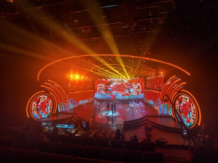 此次舞臺使用千余平光祥科技LED顯示大屏,以“宮燈”為基礎造型,整個舞臺由多個“宮燈”組成。主屏幕雙屏幕設計呼應“開門迎福氣”主旨,兩側4個“宮燈”造型的旋轉舞臺,讓演出效果更加豐富。天花板有5個內嵌組燈的六邊形造型屏幕,與光束結合時可以呈現虛幻的宮燈輪廓效果,與虛擬視效結合時可以打造出真實立體感的旋轉宮燈!