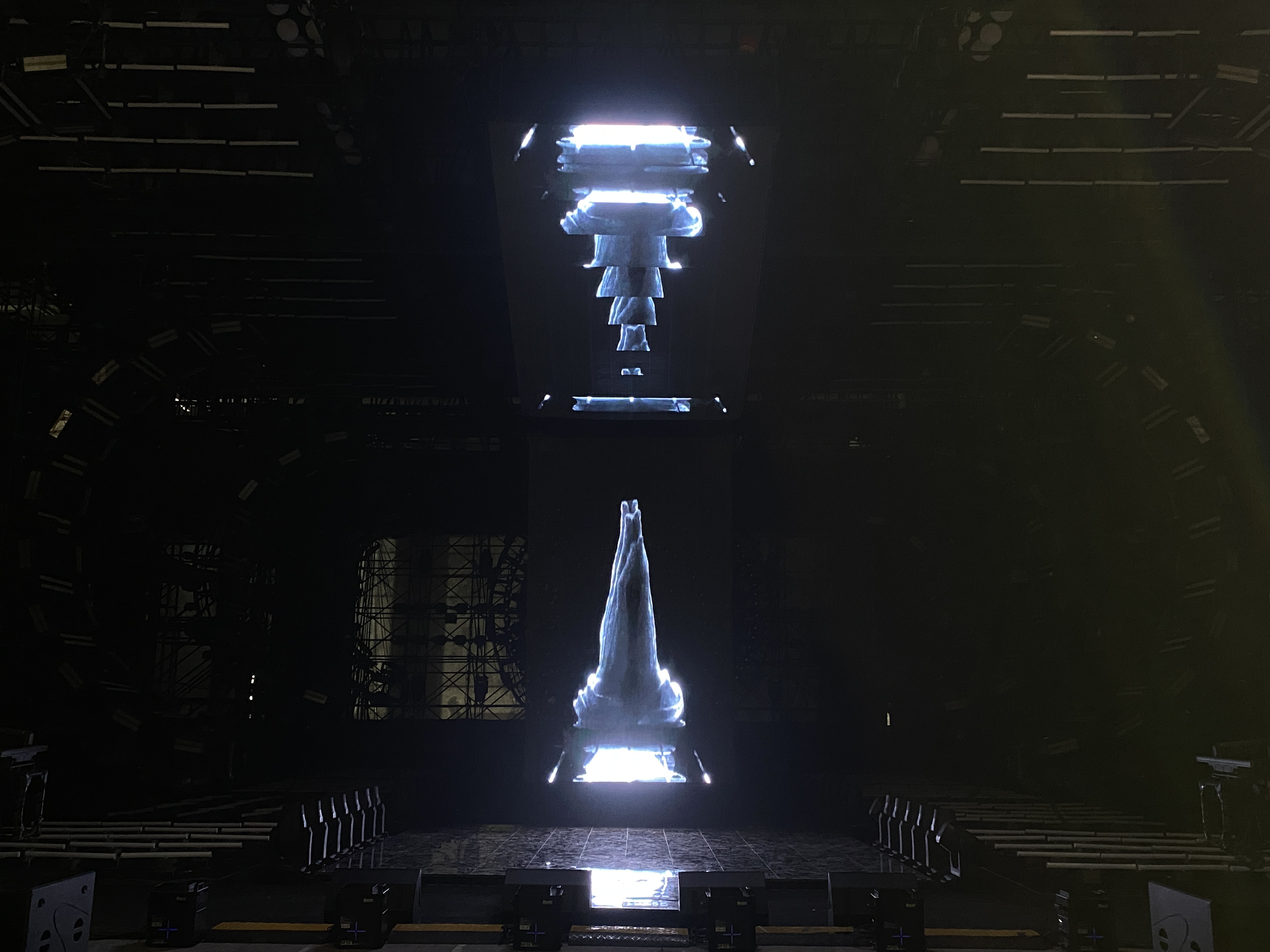 舞臺秀上空使用光祥VA系列LED顯示大屏,輕盈通透的特性,讓時空隧道更具神秘色彩,詮釋人類對于時空的認識和思考。減輕舞臺負重感的同時,也帶給觀眾無盡的想象空間。