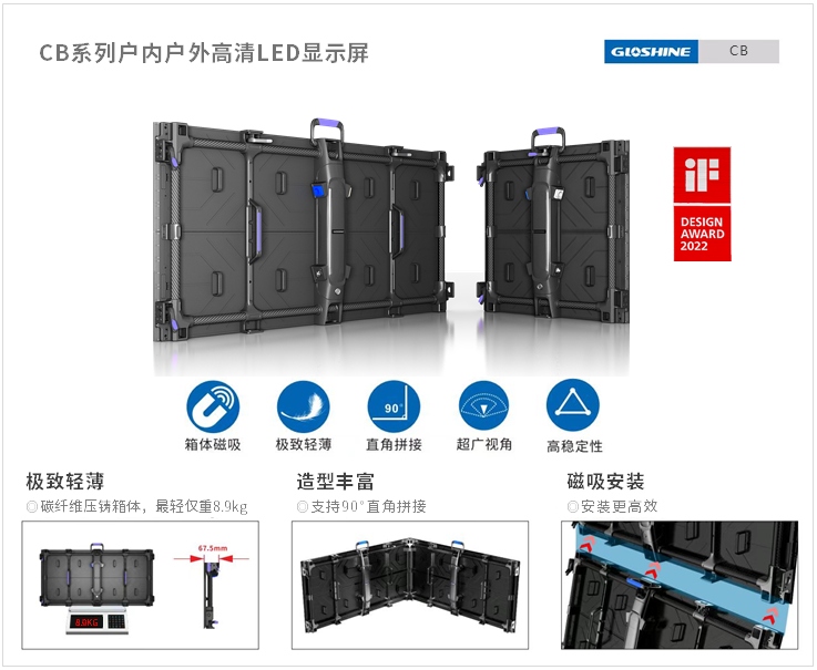 CB系列超輕量化的模組及超高強度的箱體結構,使得顯示屏的安裝、拆卸、維護更加輕便。而箱體的磁吸裝置更是極大地提高了安裝效率。