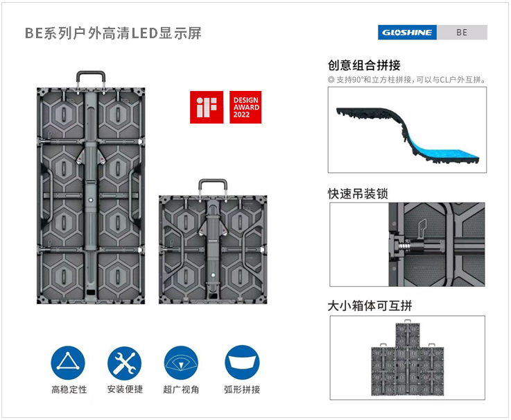 光祥BE系列戶外高清LED顯示屏,設計時尚簡約,單箱體雙快速吊裝鎖、單側雙拉緊結構,高效組裝,拼接更緊密平整。支持90°直角拼接與立方柱拼接,支持與CL系列戶外屏互相拼接,造型靈活多變。