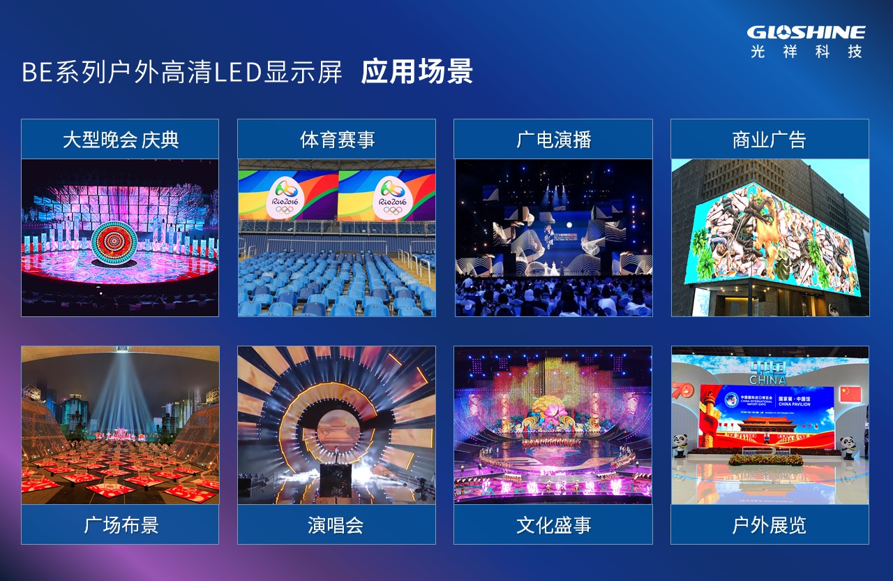 BE系列戶外屏簡約的箱體設計,絲毫不減其高穩定性,并有著超廣視角,在戶外舞臺、廣電演播、廣場布景、大型晚會、體育賽事、戶外展覽等,有著極為廣泛的應用。