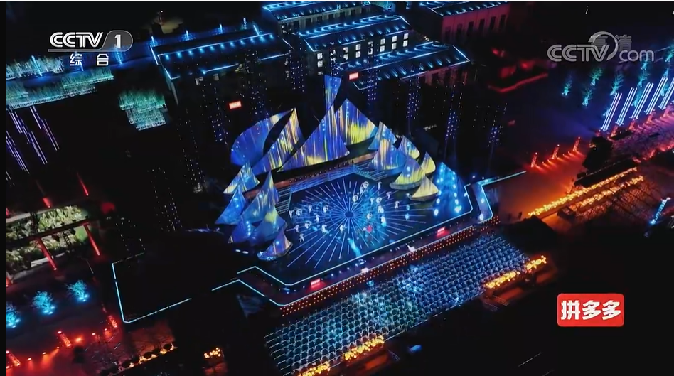 萬千星輝匯聚在浙江臺州,大大小小弧形風帆矗立于舞臺,正待啟航;地面如銀河般閃耀,漫天流星。從夜空俯視,是一艘火樹銀花妝點的巨輪,每一處都有表演舞臺。