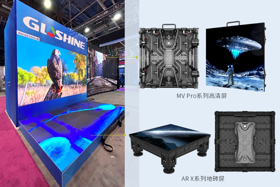 全彩LED顯示屏作為廣電演播、影視拍攝必不可少的設備,是NAB Show的最主要展示品之一。光祥科技在本次NAB Show上,主舞臺交給了MV Pro系列專業XR虛擬攝影顯示屏和X Pro系列小間距屏、AR X系列地磚屏,由MT及MT Edge塑造的裸眼3D屏和曲線屏陳設側邊,而BD系列小間距工程屏則在主舞臺背面。