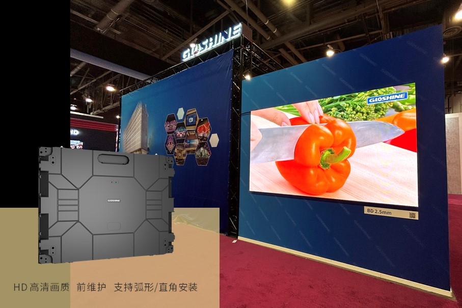 展位背面是BD系列小間距工程屏,超輕薄、低能耗、前維護,防磕碰設計,外部無線材設計,廣泛應用于直播間、會議室、宴會廳、商業廣告、安防指揮中心等。