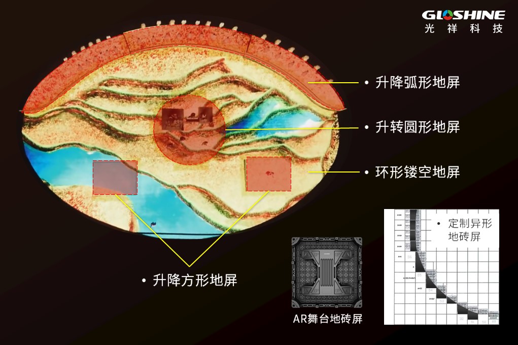 主舞臺是直徑38米乘25米、面積近800平方米的橢圓形地屏,由形狀各異的定制異形地屏拼接而成。定制異形地屏是整個舞臺造型的關鍵,它組成了舞臺中央升轉圓形地屏、環形鏤空地屏、三座升降弧形地屏的交接邊緣,由AR系列舞臺地磚屏根據舞臺實際需求進行定制,面積共計400平方米,箱體種類260種。