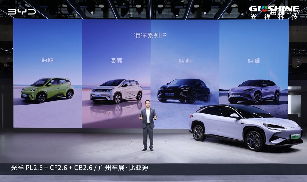 比亞迪旗下一系列品牌近乎占滿整個4.2展館,以背景屏幕和虛擬造型屏相結合的形式,賦予每個汽車獨立且立體的屏幕展示空間。在獨一份人山人海的展館里,大屏與汽車如影隨行,相益得彰。