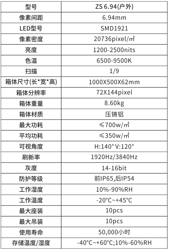 最新輕薄透箱體;可快速實現吊裝與坐裝,常規+/-2.5,5,7.5度和左右45度角,上下45度角與他角度拼接;戶內戶外通用租賃LED顯示屏,5000:1高對比度,戶外2500nits;獨特單把手設計,一個人即可完成安裝操作;模組實現上下左右通換。