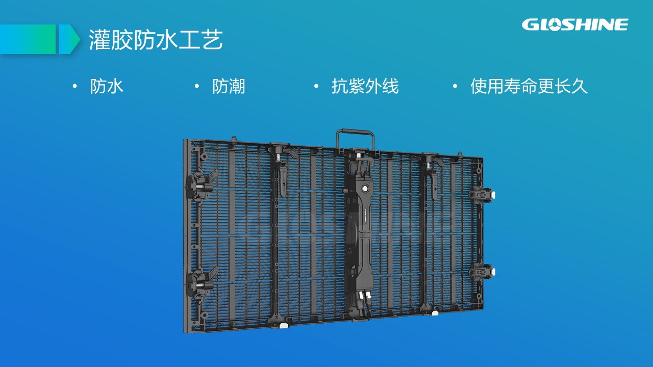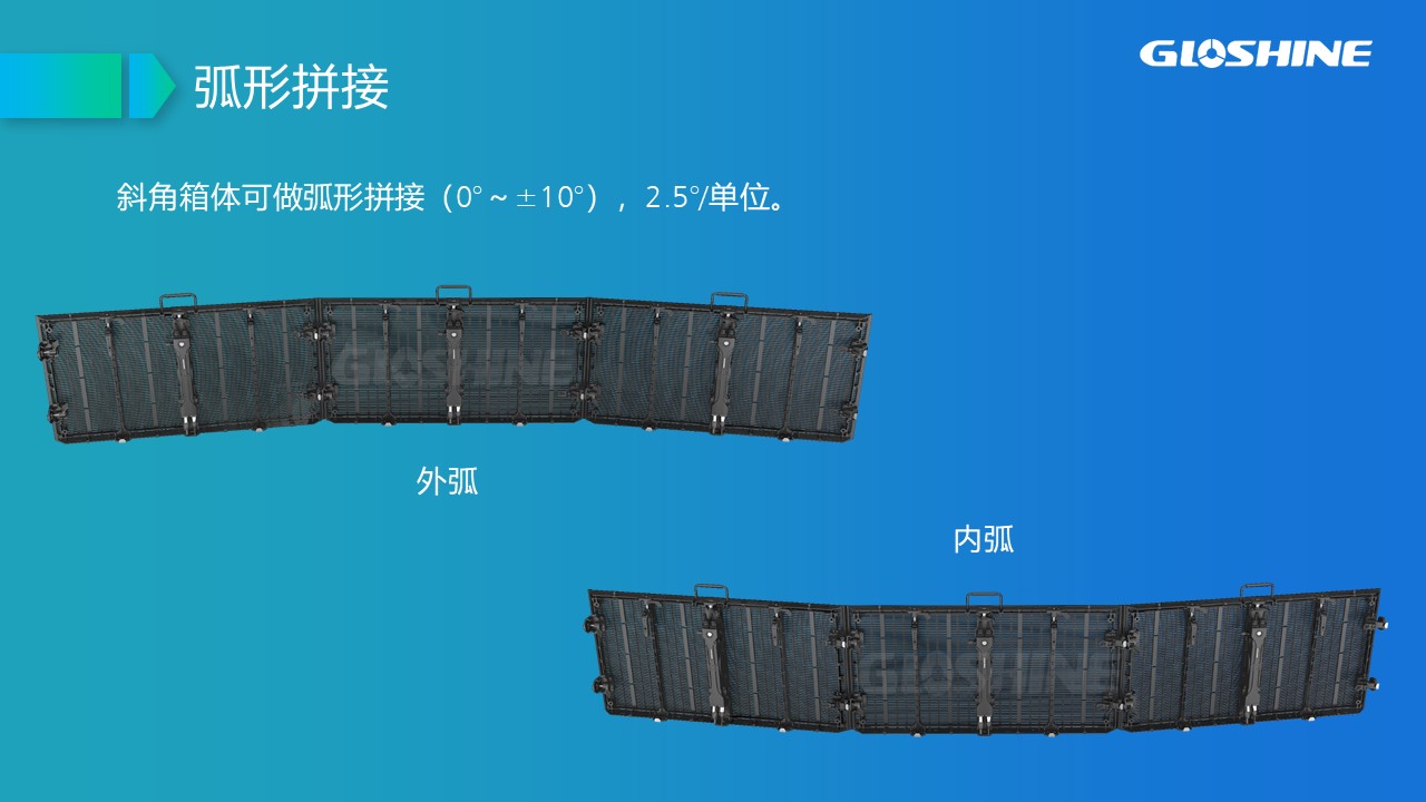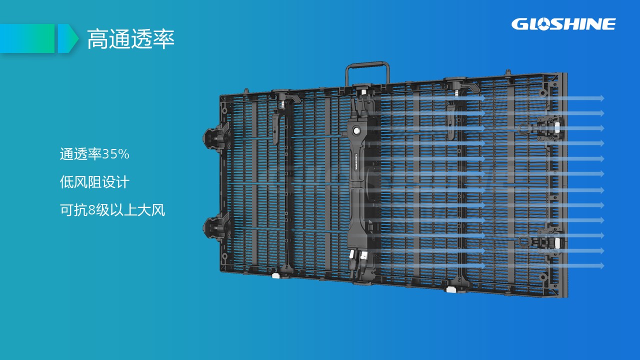 可拼弧度±10°;支持90°拼接;戶內租賃及固裝、吊裝;黑燈高亮;高通透率;超輕超薄;抗風能力強,可抗8級以上大風;LED納米鍍層防護;面罩設計,解決PCB墨色不均勻問題;后蓋一體化設計。