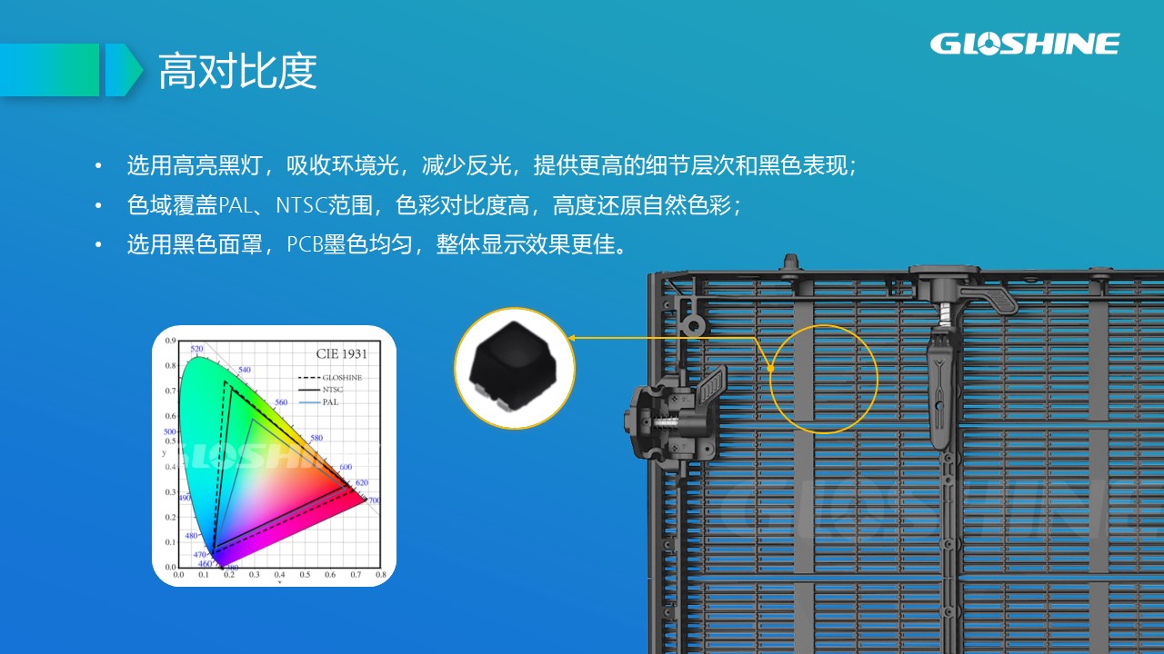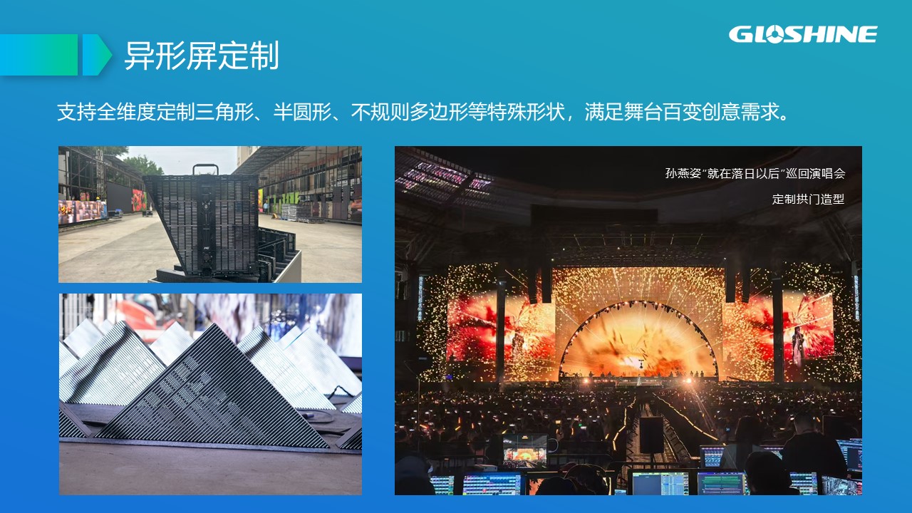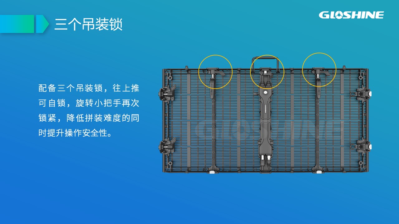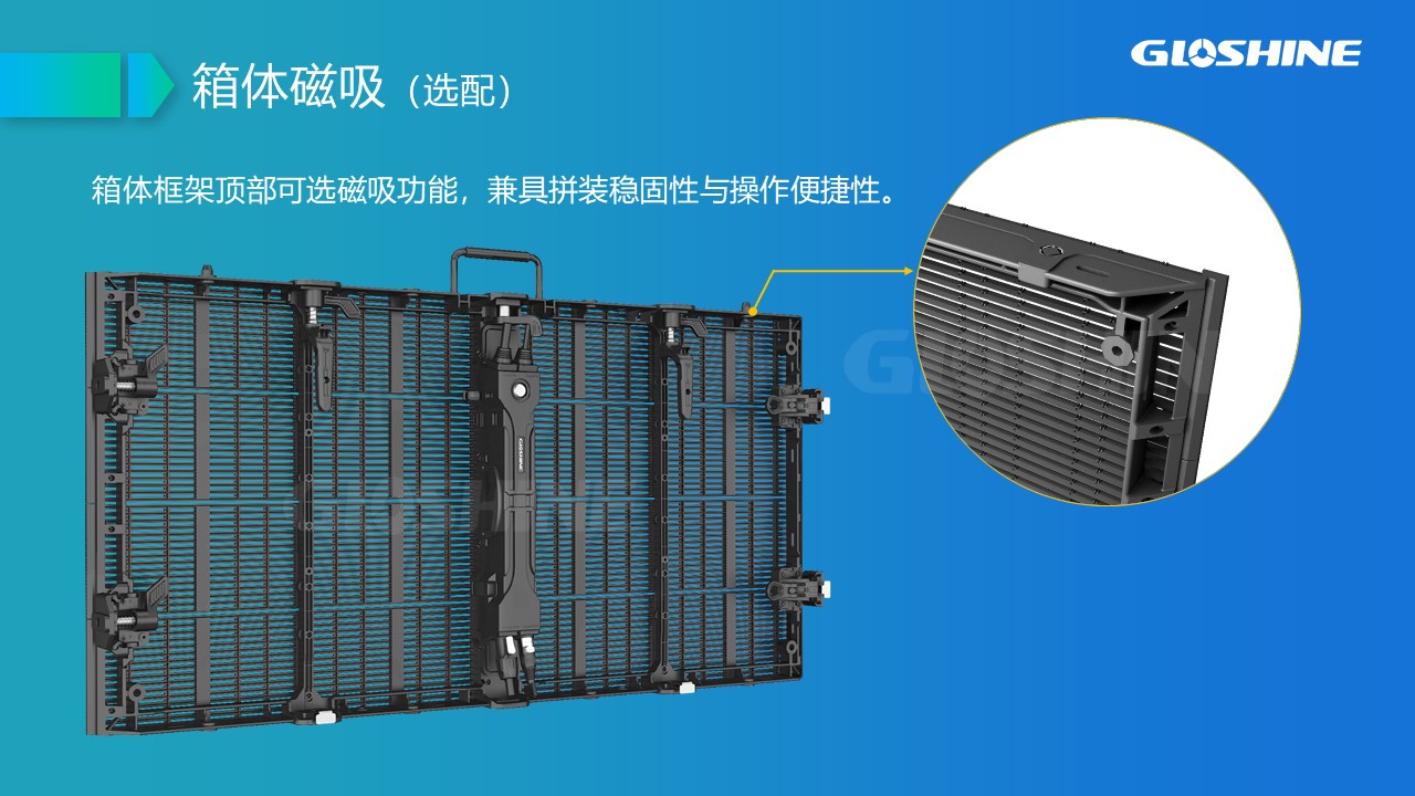 可拼弧度±10°;支持90°拼接;戶內租賃及固裝、吊裝;黑燈高亮;高通透率;超輕超薄;抗風能力強,可抗8級以上大風;LED納米鍍層防護;面罩設計,解決PCB墨色不均勻問題;后蓋一體化設計。