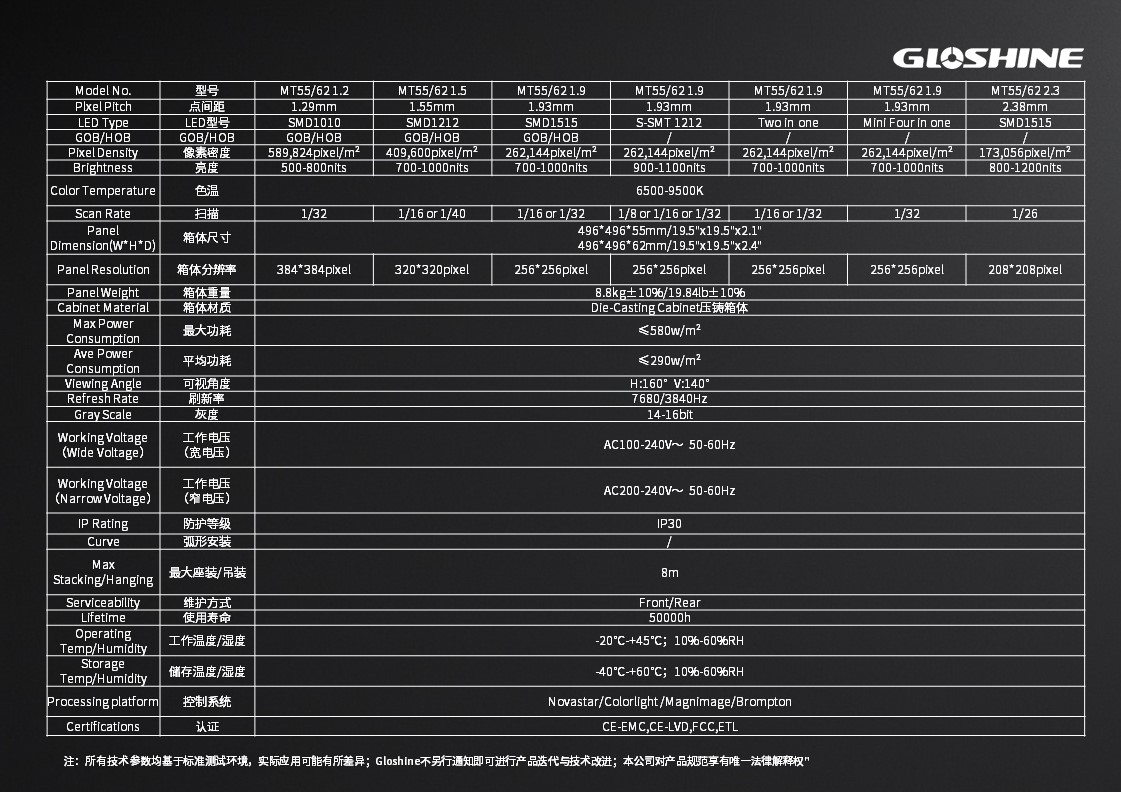 光祥MT系列LED顯示屏,擁有P1.2/1.5/1.9/2.3四種點間距,通過添加墊片調節箱體厚度,規格為496*496*55mm/62mm,完美兼容市場通用展示框架,支持單邊切45°進行直角拼接,可選GOB/HOG、S-SMT、MIP、SMD、二合一、四合一等多種工藝,可選定制化背板,滿足不同場景下的定制化需求,為租賃展示、品牌活動等場景提供穩定、高效、高品質的視覺解決方案。
